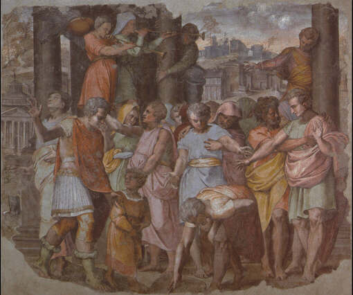 Perino’s examples are: Abraham and Isaac, Jacob wrestling with the Angel, Joseph and his Brothers, the Hebrews crossing the Jordan, Fall and Capture of Jericho, Joshua commanding Sun to stand still, Birth of Christ, Baptism and the Last Supper. Some of these are in bronze-tint, while others are in full color. He also painted, after Raphael’s drawings, figures of the planets in the great hall of the Appartamenti Borgia. Perino was soon regarded as his major assistant, second only to Giulio Romano.