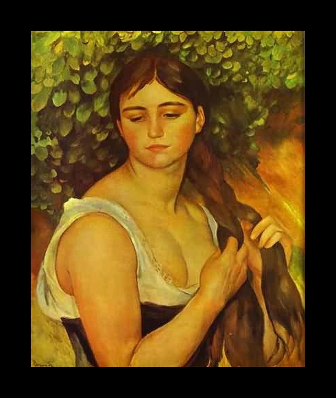 As a young woman, Valadon found her way to the Montmartre quarter of Paris where she became involved in artistic circles. It is said that she was a strikingly beautiful woman, which must have been true as she was in great demand as a model. Valadon sat for some of the most important artists of her time, namely Renoir, Degas and Toulouse-Lautrec. It is rumored that she had an affair with Renoir, and he used her in a number of his famous compositions such as “Girl Braiding her Hair.”