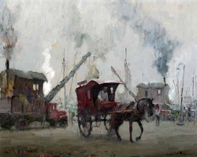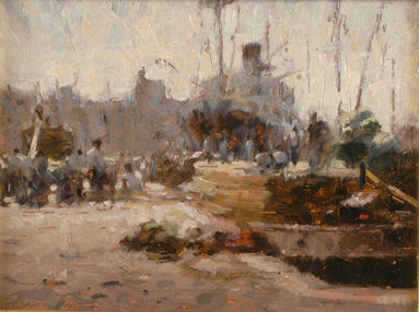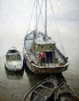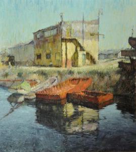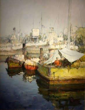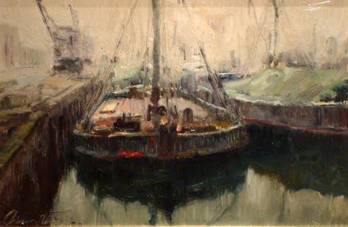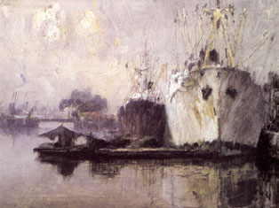Su obra está impregnada de los grises y los blancos para traducir la bruma que acompaña la luz de los puertos. En sus marinas portuarias aparecen imágnes de grúas, de barcos flotando en aguas espesas, que le permite al pintor realizar pinceladas como si manejara un remo que otorga impulso a la forma flotante.